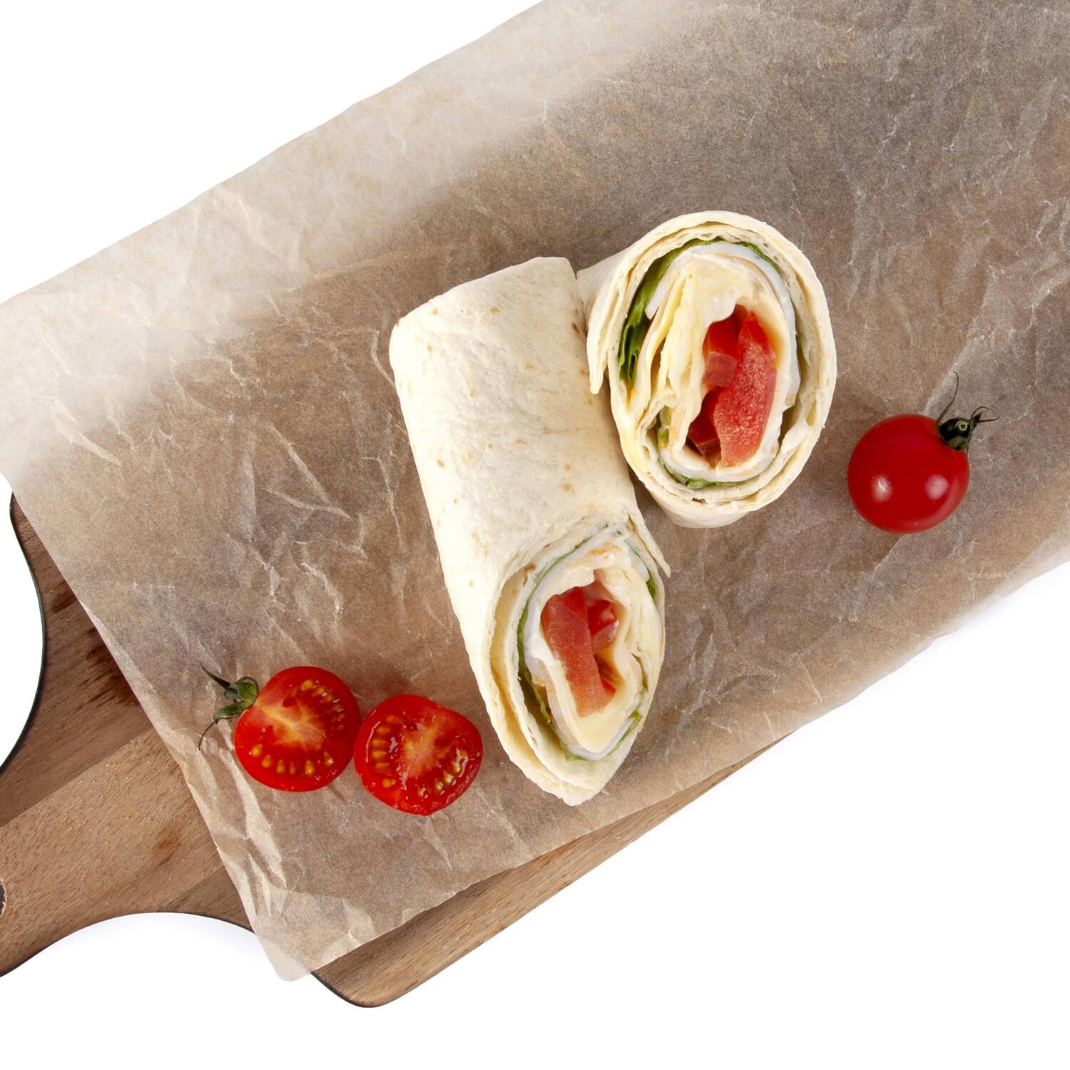 Tortilia (1 buc)90 g (făină de grîu c/s, apă potabilă, sare alimentara, maioneză 14 g(ulei de floarea soarelui rafinat, apă plată, gălbenuș de ou praf, agent de îngroșare E1422), smîntînă 20% grăsime 6 g, sare alimentară 0,2 g, usturoi uscat, piept de pui afumat 30 g, frunze de salată lola 10 g , roșii 25 g, cașcaval gauda 20 g.