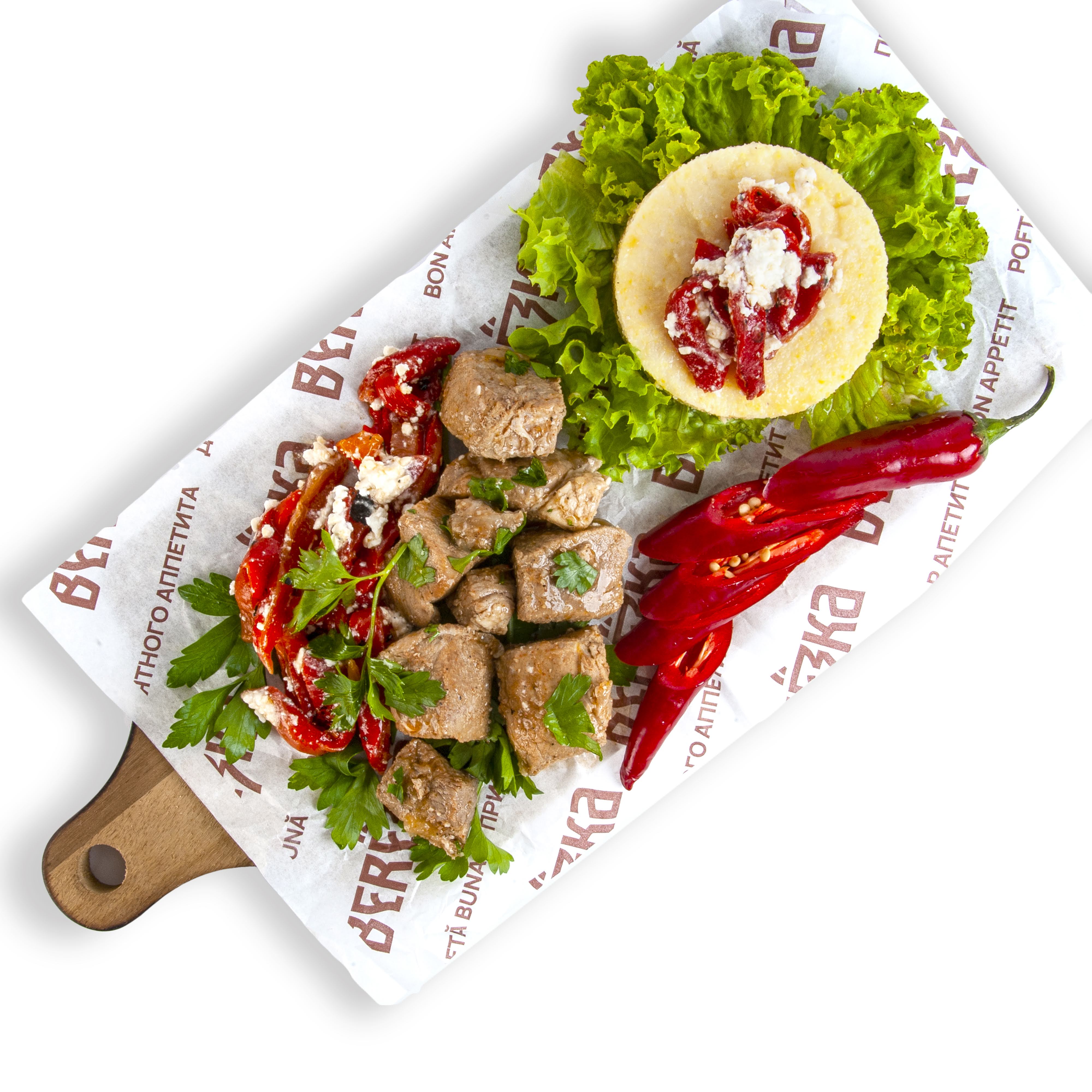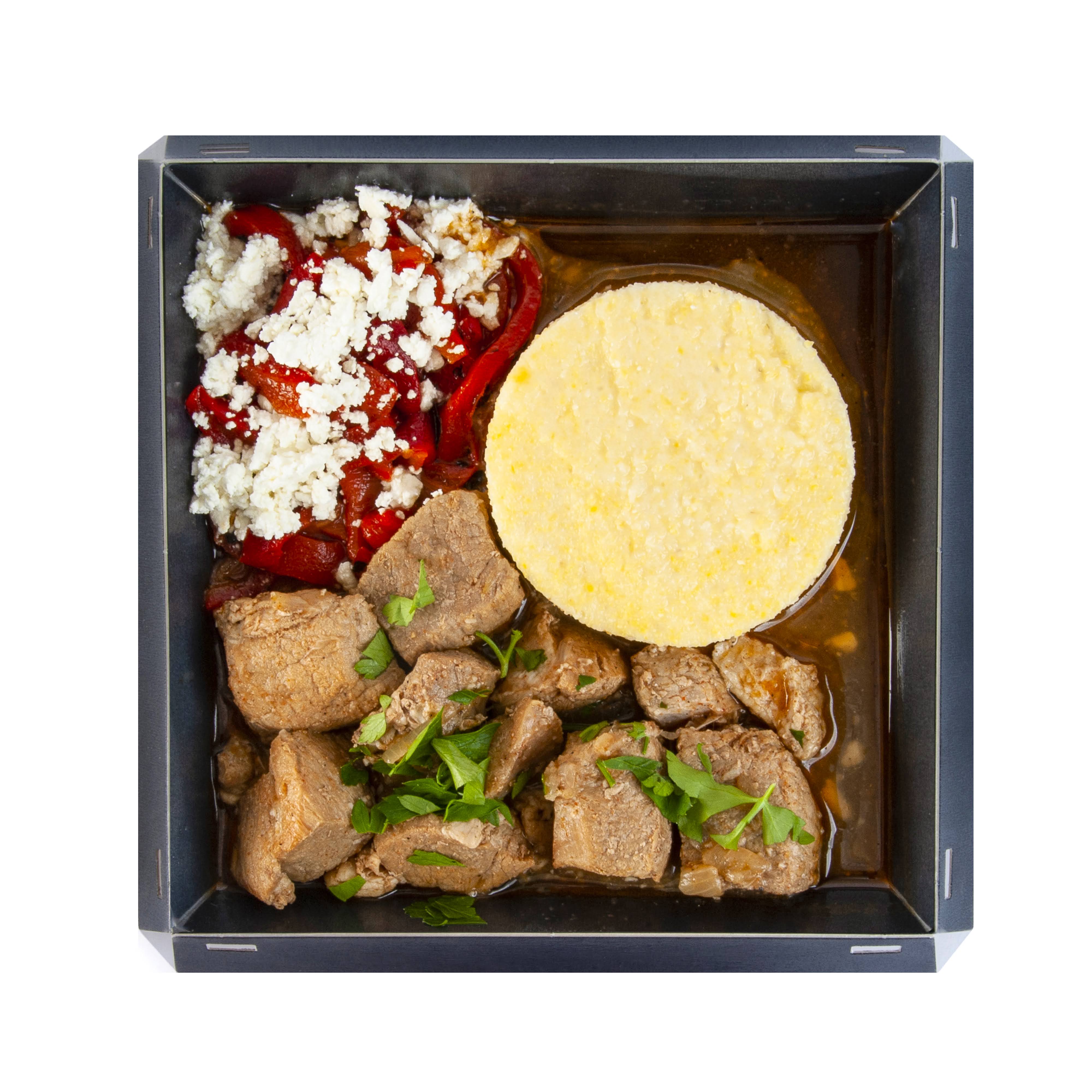 Запечённый перец в уксусе 40 г, Брынза “Телемеа” из коровьего молока 10 г (пастеризованное коровье МОЛОКО, соль, сычужный фермент, молочнокислые культуры), подсолнечное масло 5 мл, соус унаги 3 мл (вода, соевый соус (СОЯ, вода, ПШЕНИЦА, соль), сахар, мальтодекстрин, гидролизованный растительный белок, загуститель: E415, усилитель вкуса: E621, краситель: E150d, консервант: E202), свежая петрушка.